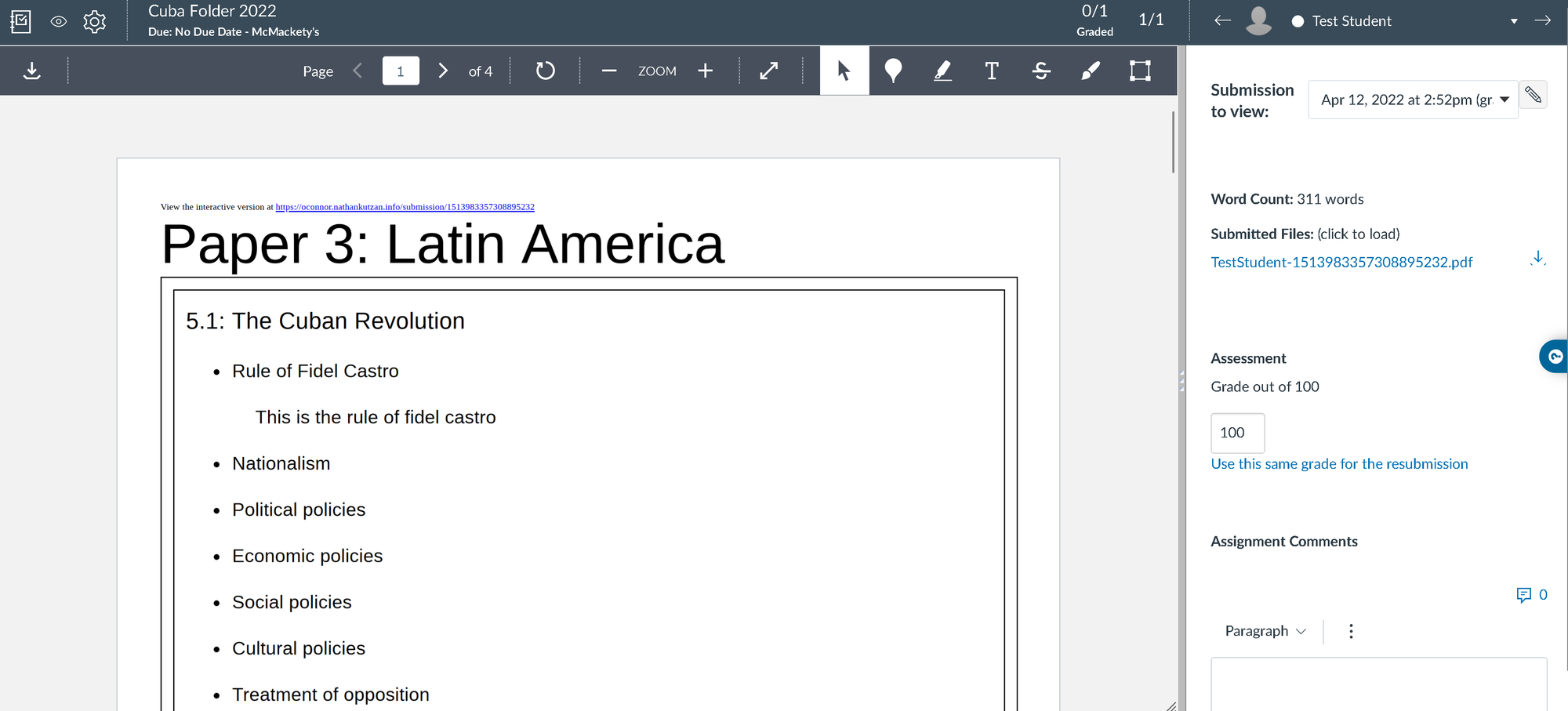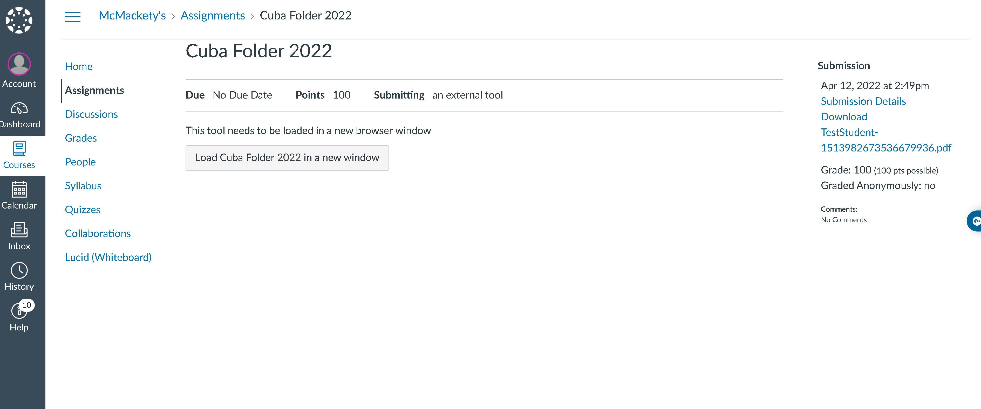Finally, the PDF generator is a NodeJS web server that will generate and serve a PDF version of a folder. It does this by creating a Puppeteer instance, loading the folder's data, displaying that all in the Puppeteer window, then saving that as a PDF and responding to the GET request with that PDF. This means that getting a PDF version of your folder is as easy as pointing your web browser to https://pdf.folders.chasemacdonnell.net/<assignment-id> (server is not online) when you are logged in. The PDF generator is also used to return a PDF version of the folder to Canvas when the folder is submitted, as can be seen below.