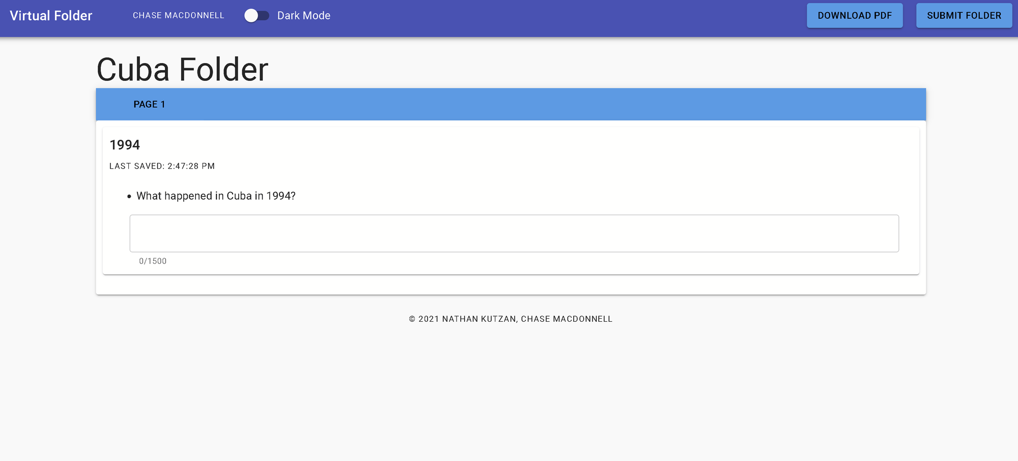 The Virtual Folder App was a LTI (Learning Tool Integration) designed to make it extremely easy to create study "Folders", a multi-page study sheet used to review for the IB (International Baccalaureate) History of Americas IA (Internal Assessment).